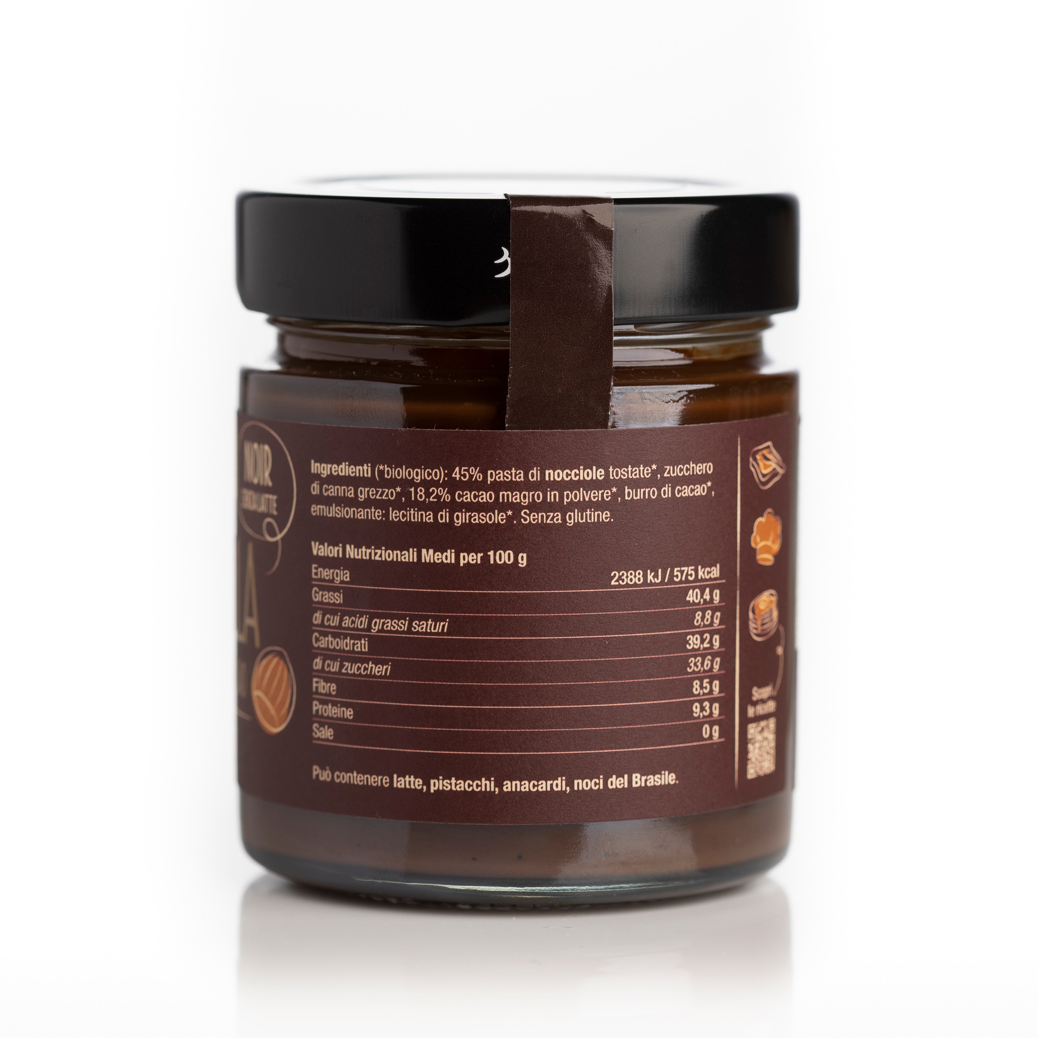 Ingredients: 45% toasted Italian hazelnuts, raw cane sugar, low-fat cocoa, toasted peeled almond paste, almond oil