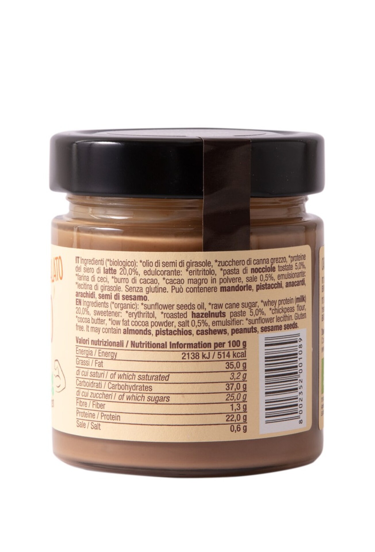 Ingredients (*organic): *sunflower seed oil, *raw cane sugar, *whey protein 20.0%, sweetener: *erythritol, *toasted hazelnut paste 5.0%, *chickpea flour, *cocoa butter, *fat-reduced cocoa powder, salt 0.5%, emulsifier: *sunflower lecithin. Gluten free.